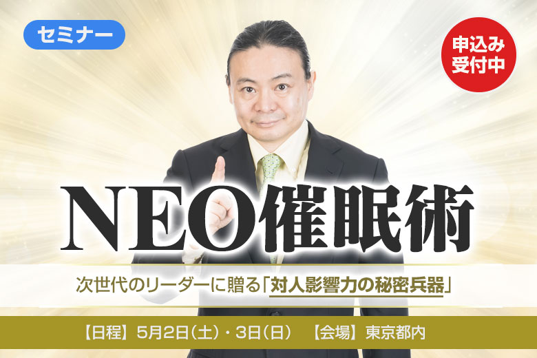 イベント・セミナーお知らせ最新情報 NEO催眠術 by wpmaster 2026年4月16日 2026年4月16日 かつて、「催眠術(ヒプノーシス)」はエセ科学の烙印が押され、 学術の表舞台からアングラへと追いやられた。 精神科医が当たり前に使う時代になった今もなお、 邪法か奇術かのイメージは払拭されない。 この不遇の歴史を持つマインド・テクノロジーを、 脱洗脳の専門家「苫米地博士」が 新パラダイムへと進化させる! 詳しくはこちらから。